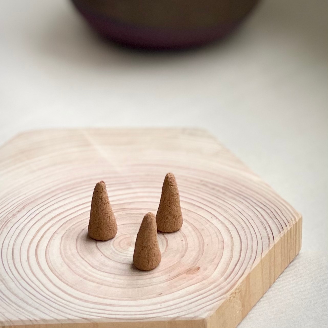 このお香は間伐材を加工する際に出る木の粉を活かし、アーユルヴェーダのハーブと天然香木や樹脂で調香し、たぶ粉とふのりでつなぎ合わせています。化学糊や香料、エッセンシャルオイルも使用していない、自然のままの香りです。